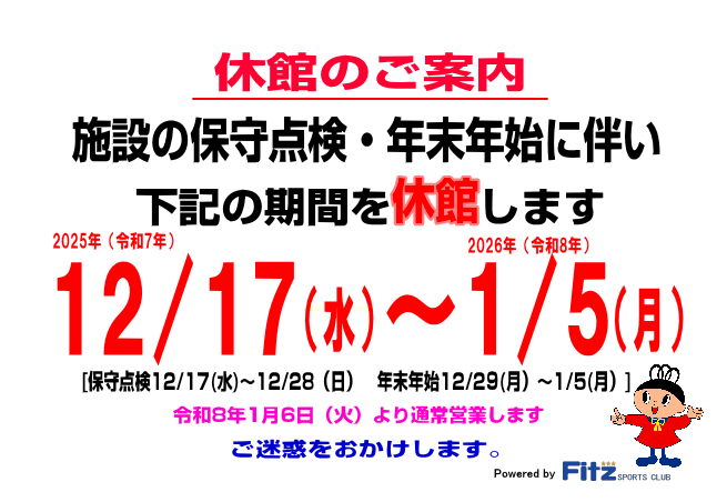 【ご案内】12月・年末年始休館日